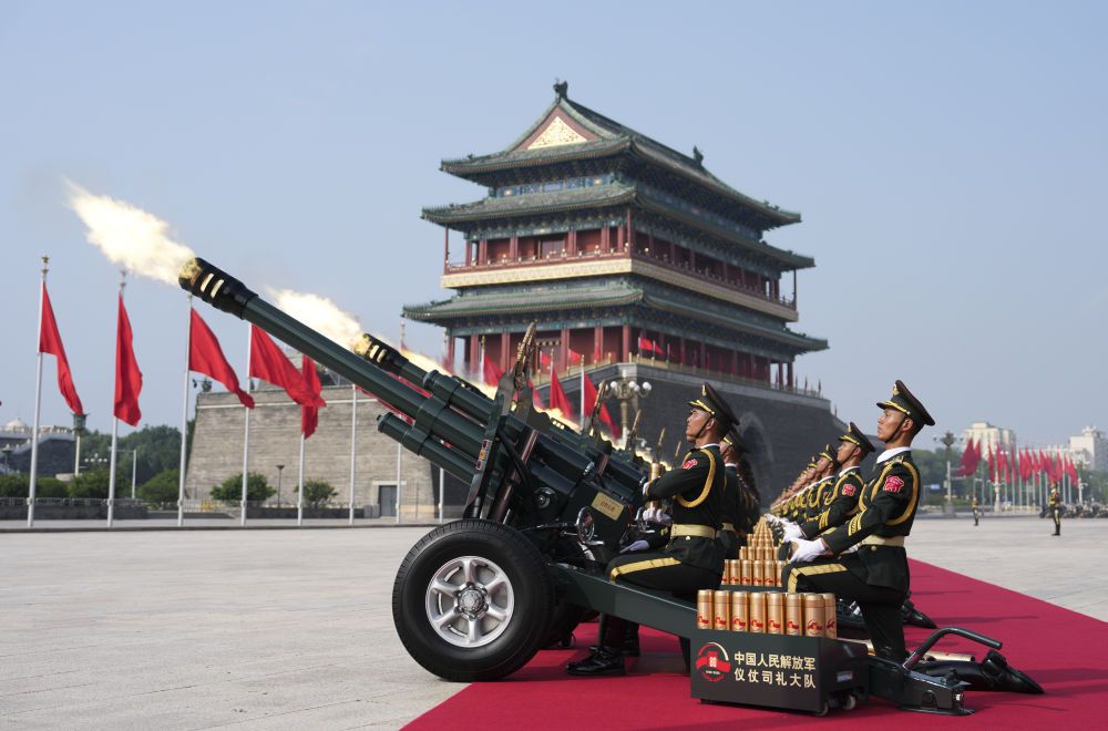 2025年9月3日,紀念中國人民抗日戰爭暨世界反法西斯戰爭勝利80周年大會在北京隆重舉行。這是禮炮在天安門廣場鳴響。新華社記者 牟宇 攝