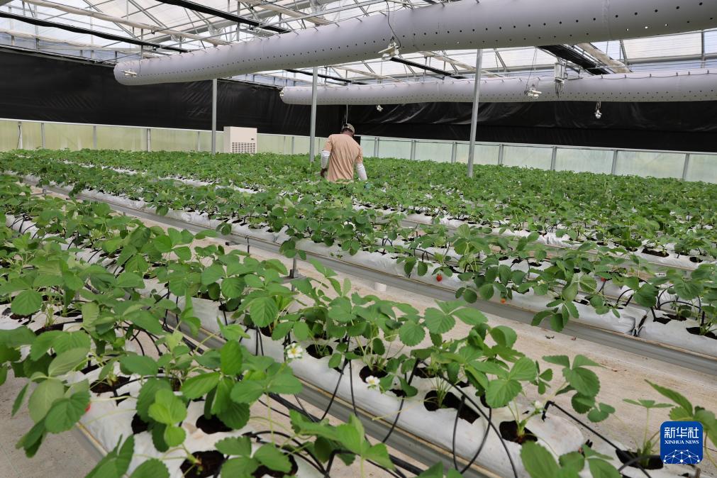 這是11月3日在文萊斯里巴加灣市郊一處農業科技產業園拍攝的運用中國農業技術和設備培育出的草莓。