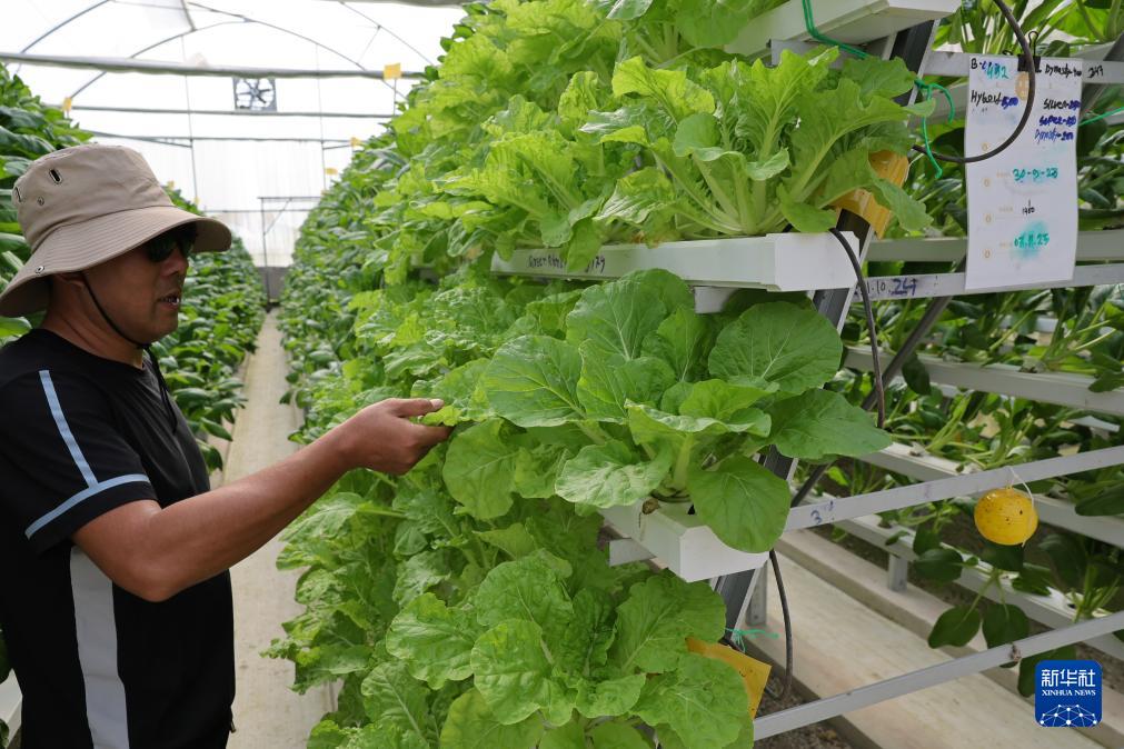 11月3日,在文萊斯里巴加灣市郊一處農業科技產業園,來自中國寧夏回族自治區固原市的農業技術專家李繼華查看用水培技術種植的蔬菜的生長情況。
