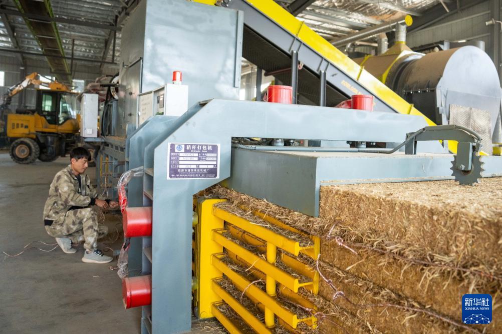 11月5日,在位于長沙縣開慧鎮的長沙萱凡農業發展有限公司秸稈飼料化加工車間,工人操作秸稈打包機。