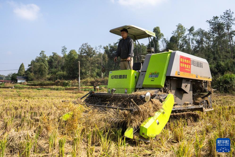 11月5日,在長沙縣開慧鎮開慧村,村民操作自走式秸稈打捆機回收水稻秸稈。