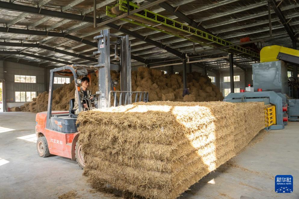 11月5日,在位于長沙縣開慧鎮的長沙萱凡農業發展有限公司秸稈飼料化加工車間,工人存放制作好的秸稈飼料。