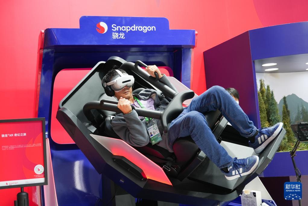 11月6日,參觀者在第八屆進博會技術裝備展區高通展臺體驗XR設備。
