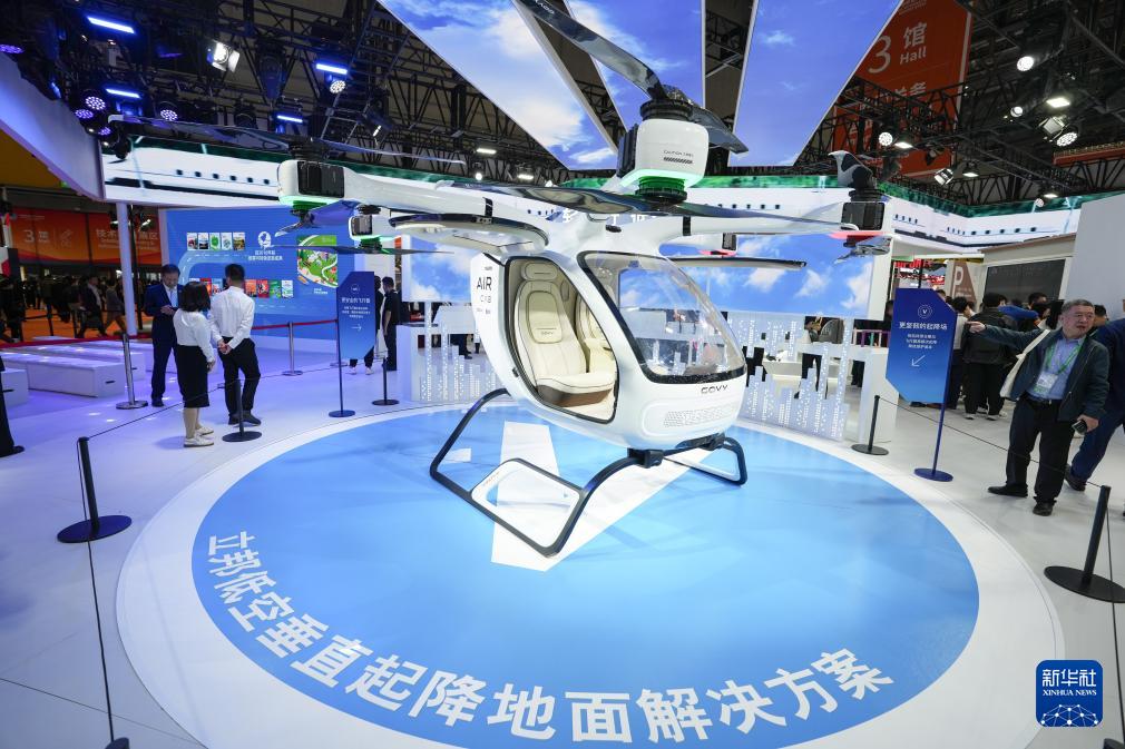 11月6日,在第八屆進博會汽車及智慧出行展區的科技展臺,展商(中)在向觀眾介紹E20 eVTOL電動垂直起降飛行器。